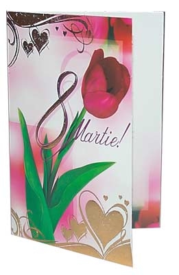 Felicitare de lux 13/18 cm, dubla, tiparita in policromie fata+verso lacuita UV, cu text folio auriu, cu glitter, cu plic si ambalaj individual inclus. Carton de 215 gr/mp alb, din import.