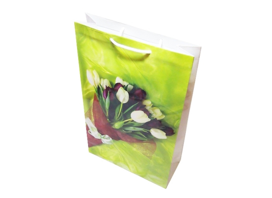 Punga cadou primavara, 24/39/10 cm, tiparita in policromie pe hartie de 150 gr/mp, plastifiata, cu capse, cu manere din polipropilena.
